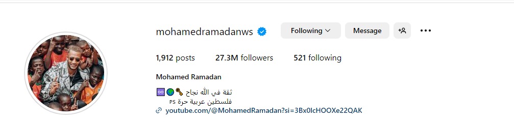 وكتب محمد رمضان في النبذة المختصرة عبر حسابه الشخصي على إنستجرام: فلسطين حرة مستقلة.