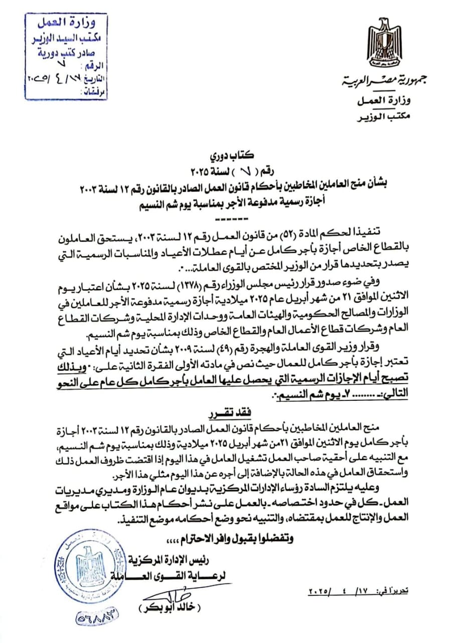 وأصدرت “الوزارة” ،اليوم كتابين دوريين رقم 7 و 8 لسنة 2025، بشأن منح العاملين المخاطبين بأحكام قانون العمل الصادر بالقانون رقم 12 لسنة 2003 ،إجازة رسمية مدفوعة الأجر بمناسبة عيد شم النسيم، وعيد تحرير سيناء ،