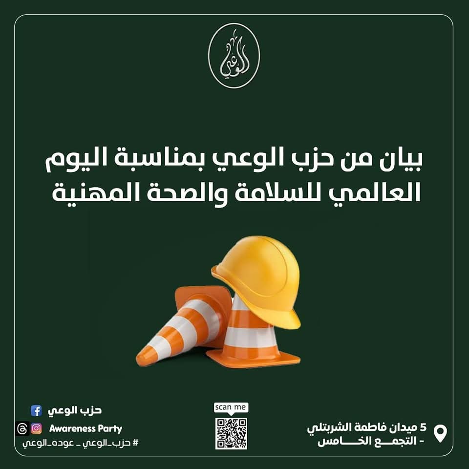 ويغتنم حزب الوعي هذه المناسبة ليحيي الجهود الوطنية المبذولة لحماية حق العامل المصري في بيئة عمل آمنة وخالية من المخاطر المهنية.