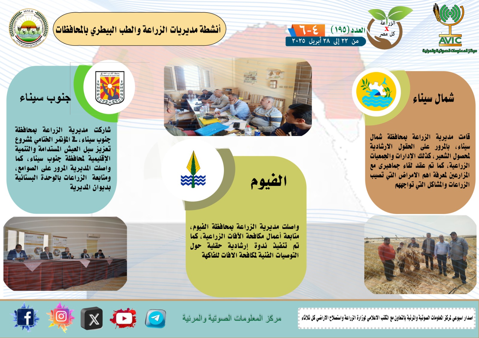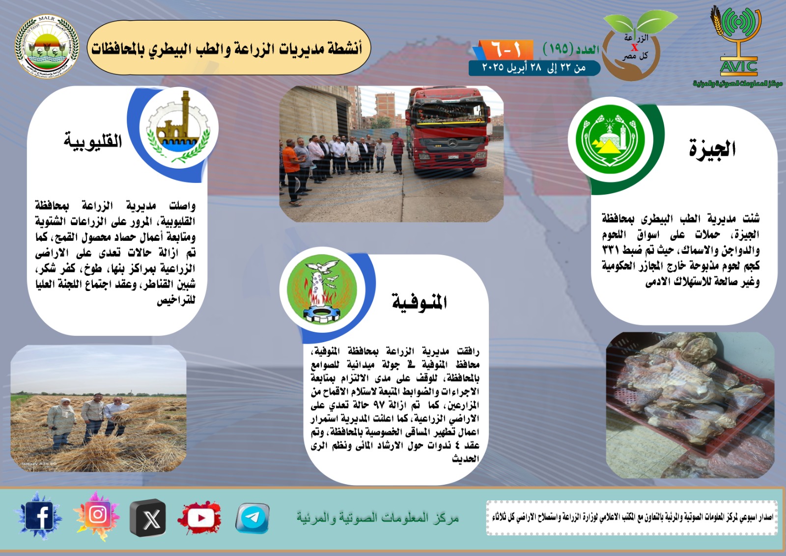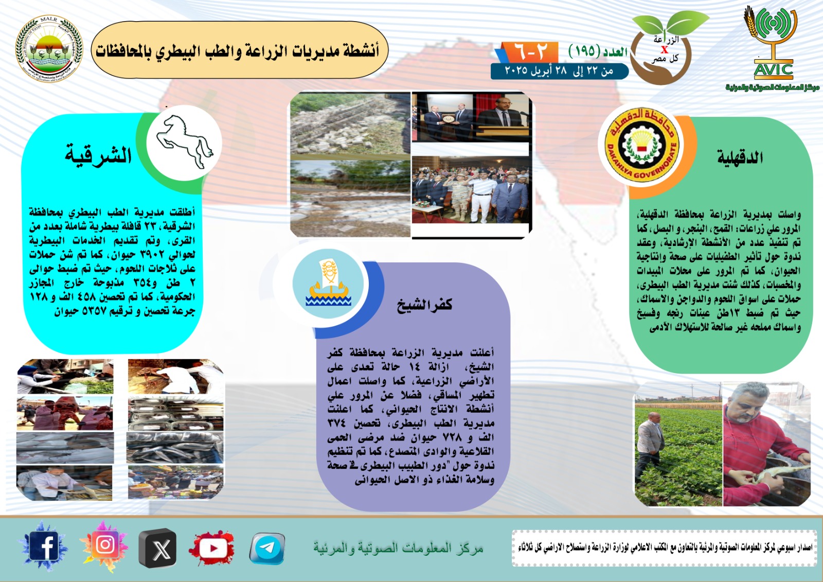 أصدر مركز المعلومات الصوتية والمرئية التابع لوزارة الزراعة واستصلاح الأراضي، والمكتب الاعلامي للوزارة، العدد رقم ١٩٥ من اصدار: “الزراعة في كل مصر” بالانجراف والفيديو، يوضح الجهود والانشطة التي تقوم بها مديريات الزراعة والطب البيطري بمحافظات الجمهورية خلال الفترة من ٢٢ وحتى ٢٨ ابريل الجاري.