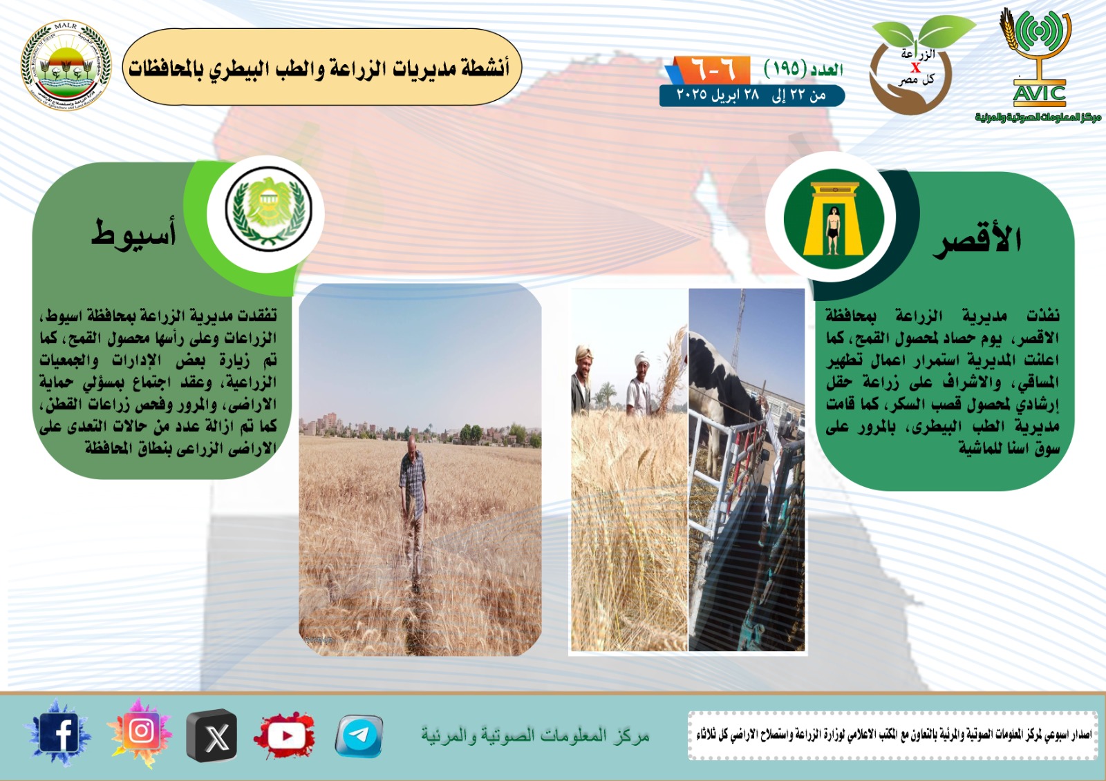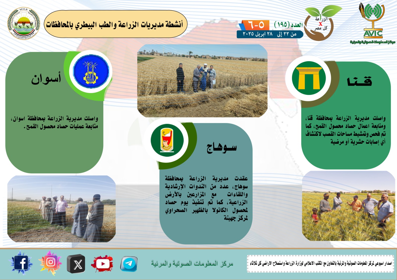 كما نفذت مديرية الزراعة بمحافظة الاقصر، يوم حصاد لمحصول القمح، كما اعلنت المديرية استمرار اعمال تطهير المساقي، والاشراف على زراعة حقل إرشادي لمحصول قصب السكر، كما قامت مديرية الطب البيطرى، بالمرور على سوق اسنا للماشية، كما واصلت مديرية الزراعة بمحافظة اسوان، متابعة عمليات حصاد محصول القمح.