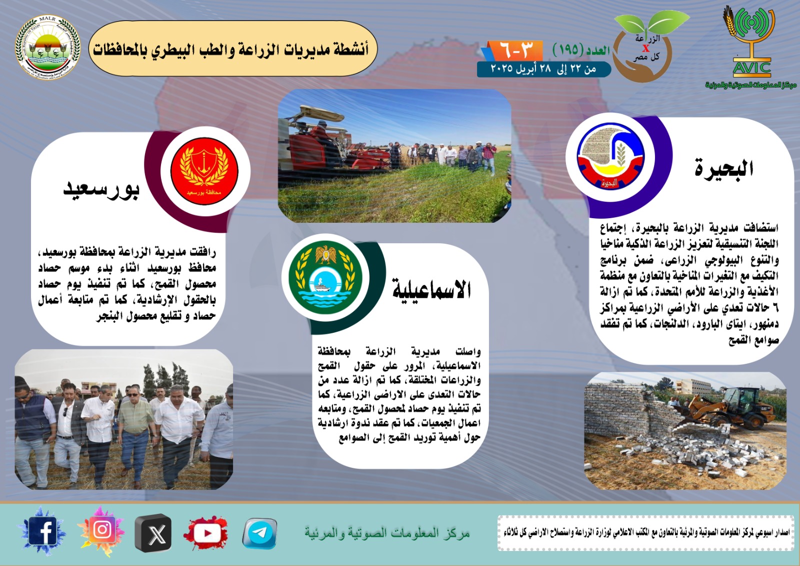 ورافقت مديرية الزراعة بمحافظة بورسعيد، محافظ بورسعيد اثناء بدء موسم حصاد محصول القمح، كما تم تنفيذ يوم حصاد بالحقول الإرشادية، كما تم متابعة أعمال حصاد و تقليع محصول البنجر،
