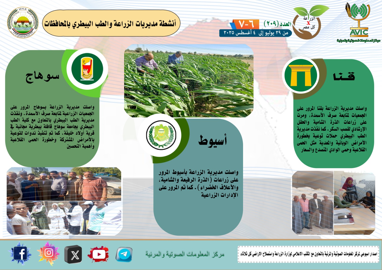 أصدر مركز المعلومات الصوتية والمرئية التابع لوزارة الزراعة واستصلاح الأراضي، بالتعاون مع المكتب الإعلامي للوزارة، العدد رقم 209 من سلسلة “الزراعة في كل مصر”، والذي يُعرض بصيغة إنفوجراف وفيديو، ويسلط الضوء على أنشطة وجهود مديريات الزراعة والطب البيطري في جميع محافظات الجمهورية خلال الفترة من 29 يوليو إلى 4 أغسطس 2025.
