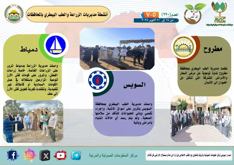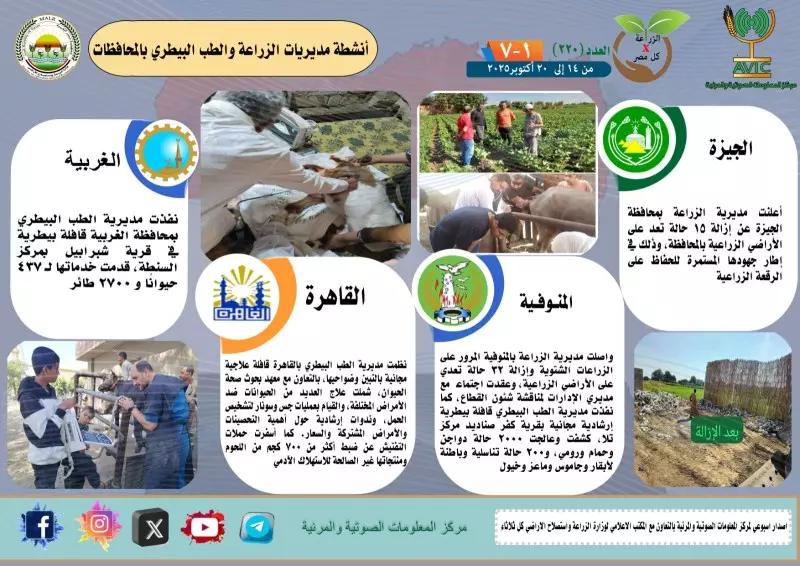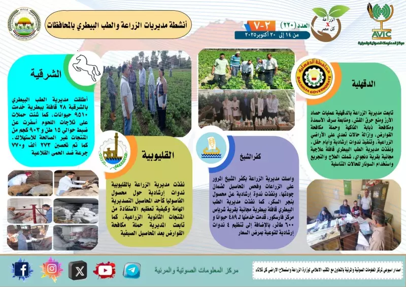 أصدر مركز المعلومات الصوتية والمرئية التابع لوزارة الزراعة واستصلاح الأراضي، والمكتب الاعلامي للوزارة، العدد رقم 220 من اصدار: “الزراعة في كل مصر” بالانفوجراف والفيديو، يوضح الجهود والانشطة التي تقوم بها مديريات الزراعة والطب البيطري بمحافظات الجمهورية خلال الفترة من 14 إلى 20 اكتوبر الجاري