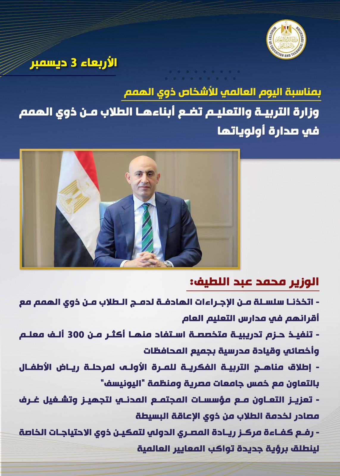 بمناسبة اليوم العالمي للأشخاص ذوي الهمم، تؤكد وزارة التربية والتعليم والتعليم الفني حرصها الدائم على وضع أبنائها من الطلاب ذوي الهمم في صدارة أولوياتها، وبذل كل الجهود لضمان تعليم عالي الجودة لهم دون أي تمييز.