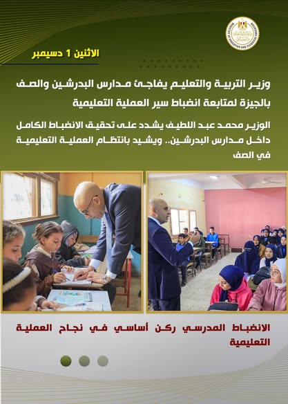 وخلال جولته، قام السيد الوزير محمد عبد اللطيف بزيارة مدرسة الشهيد محمد أبو زيد الثانوية بنات، والتي تضم 1793 طالبة، ومدرسة الشهيد العميد عاطف الإسلامبولي الإعدادية بنين التي تضم 1850 طالبًا، بالإضافة إلى مدرسة البدرشين الجديدة الابتدائية التي تضم 986 طالبًا وطالبة.