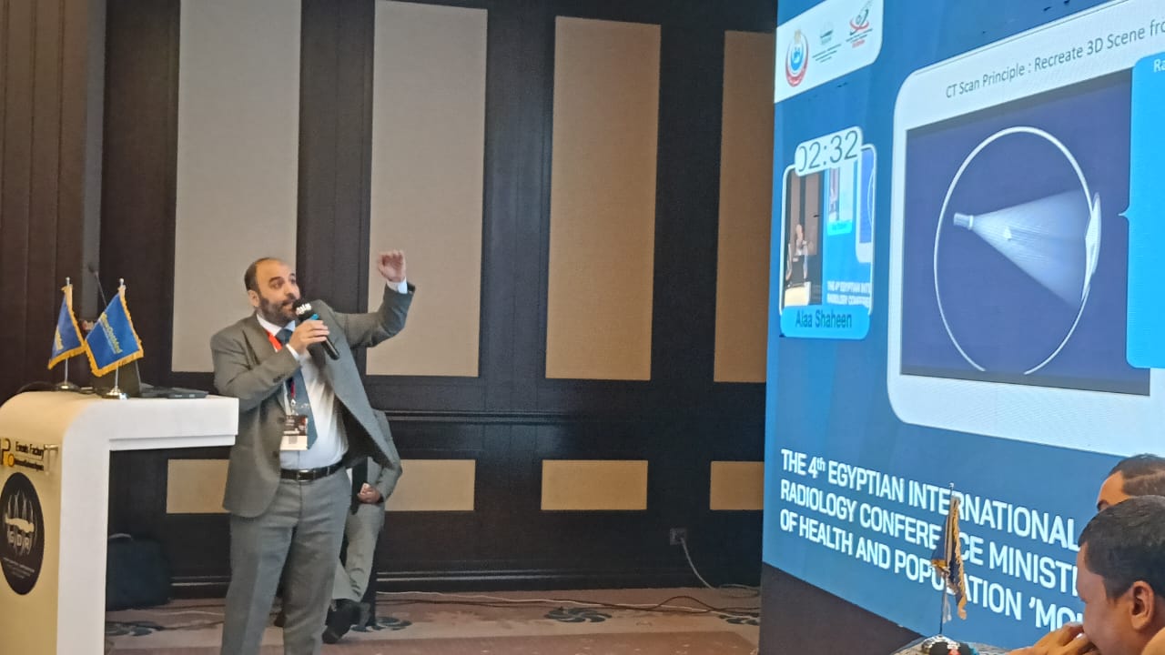 عرض أحمد السيد الدبيكي، نقيب العلوم الصحية، خلال محاضرة في اليوم الأول، ضمن فعاليات المؤتمر الدولي الرابع للأشعة،