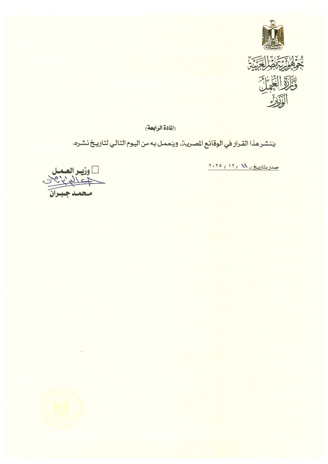 في إطار نشر القرارات التنفيذية لقانون العمل الجديد رقم 14 لسنة 2025، أعلن وزير العمل،