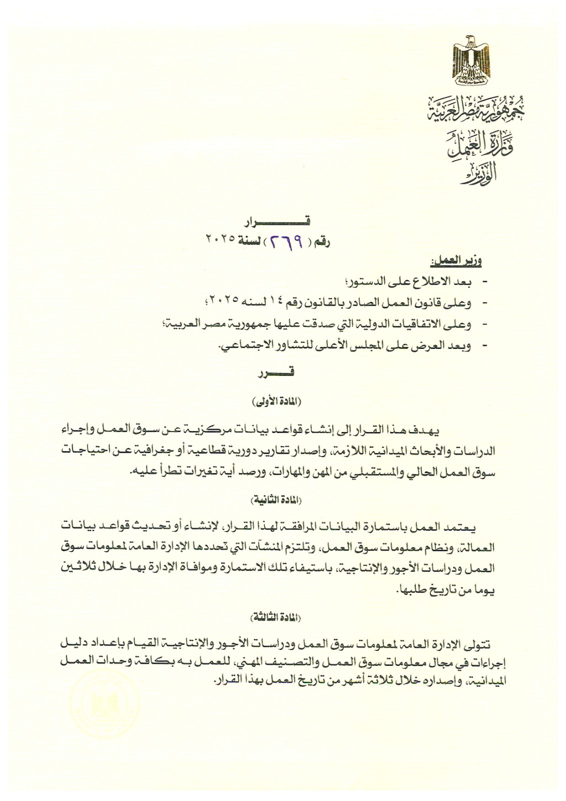 وزير العمل يصدر القرار الوزاري رقم 269 لسنة 2025 لإنشاء وتحديث قواعد بيانات سوق العمل