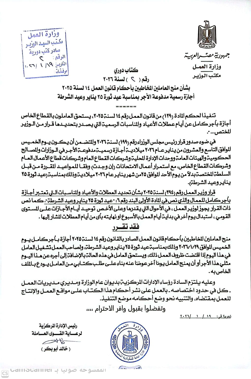 أعلن وزير العمل، محمد جبران، عن إصدار الكتاب الدوري رقم (2) لسنة 2026، والذي ينص على منح العاملين