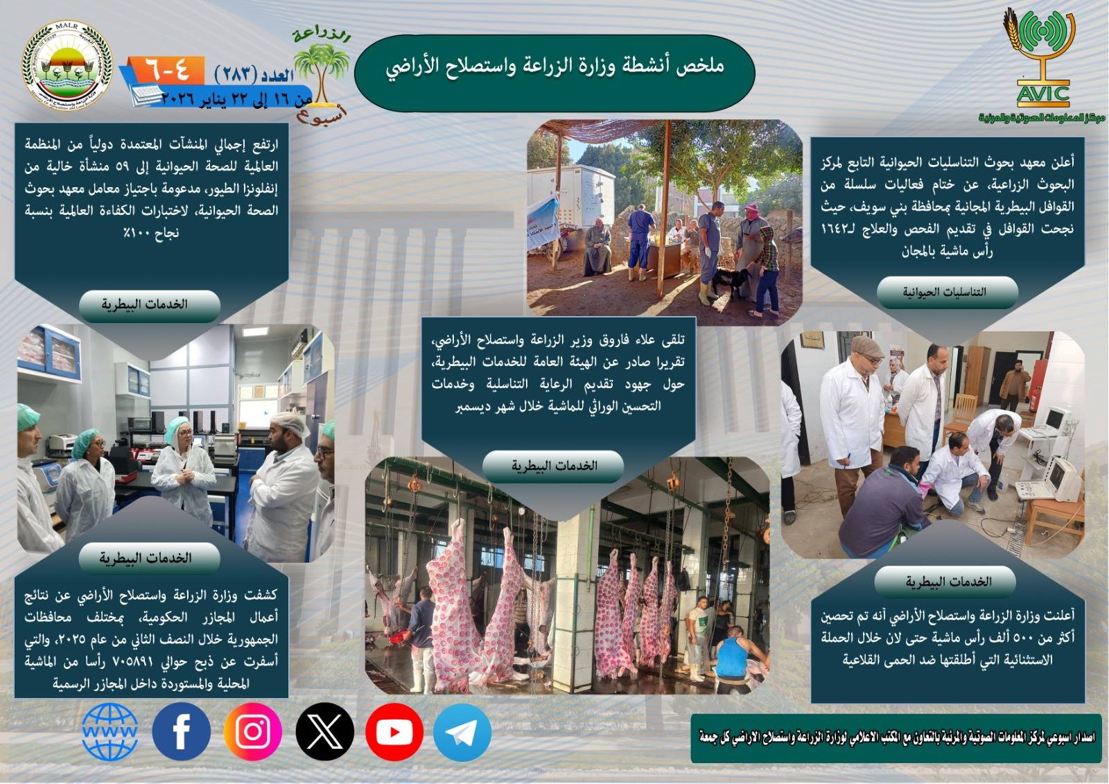 كما تلقى علاء فاروق وزير الزراعة واستصلاح الأراضي، تقريرا من المهندس محمد الخطيب المدير التنفيذي للهيئة العامة للإصلاح الزراعي، استعرض خلاله أبرز أنشطة وجهود الهيئة والجهات التابعة بجميع المحافظات خلال شهر ديسمبر الماضي، بينما نظم مركز بحوث الصحراء ورشة عمل بواحة سيوة تحت عنوان «التحديات البيطرية وسبل تنمية الثروة الحيوانية»، بهدف تمكين المربين ورفع كفاءة الإنتاج الحيواني والداجني بالواحة، كما أعلنت وزارة الزراعة واستصلاح الأراضي مواصلة الزيارات الميدانية من خلال المعاهد البحثية المختصة، تنفيذ لتوجيهات علاء فاروق وزير الزراعة واستصلاح الأراضي، بضرورة النزول إلى الحقول وتعزيز الدور الإرشادي لدعم الفلاح المصري.