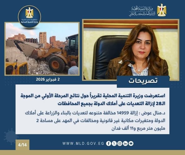 وتلقت الدكتورة منال عوض وزيرة التنمية المحلية والقائم بأعمال وزير البيئة ، تقريراً من قطاع الإدارة الإستراتيجية والتنمية المحلية بالوزارة حول جهود الأجهزة التنفيذية بالمحافظات في تنفيذ المرحلة الأولي من الموجة الــ 28 لإزالة التعديات على أملاك وأراضي الدولة والتصدي لكافة أنواع التعديات والمخالفات، مشيرًة إلى أن عدد المخالفات التي تم إزالتها بلغت حوالي 14949 مخالفة متنوعة ، حيث تم إزالة عدد 4405 حالة تعدى على أملاك الدولة من الحالات المستهدفة بينها إزالة وإسترداد عدد 3153 حالة تعدى بالبناء على أملاك الدولة بمساحة 1,4 مليون متر مربع ، و إزالة واسترداد عدد 1252 حالة تعدى بالزراعة على أملاك الدولة بمساحة 11072 فدان.
