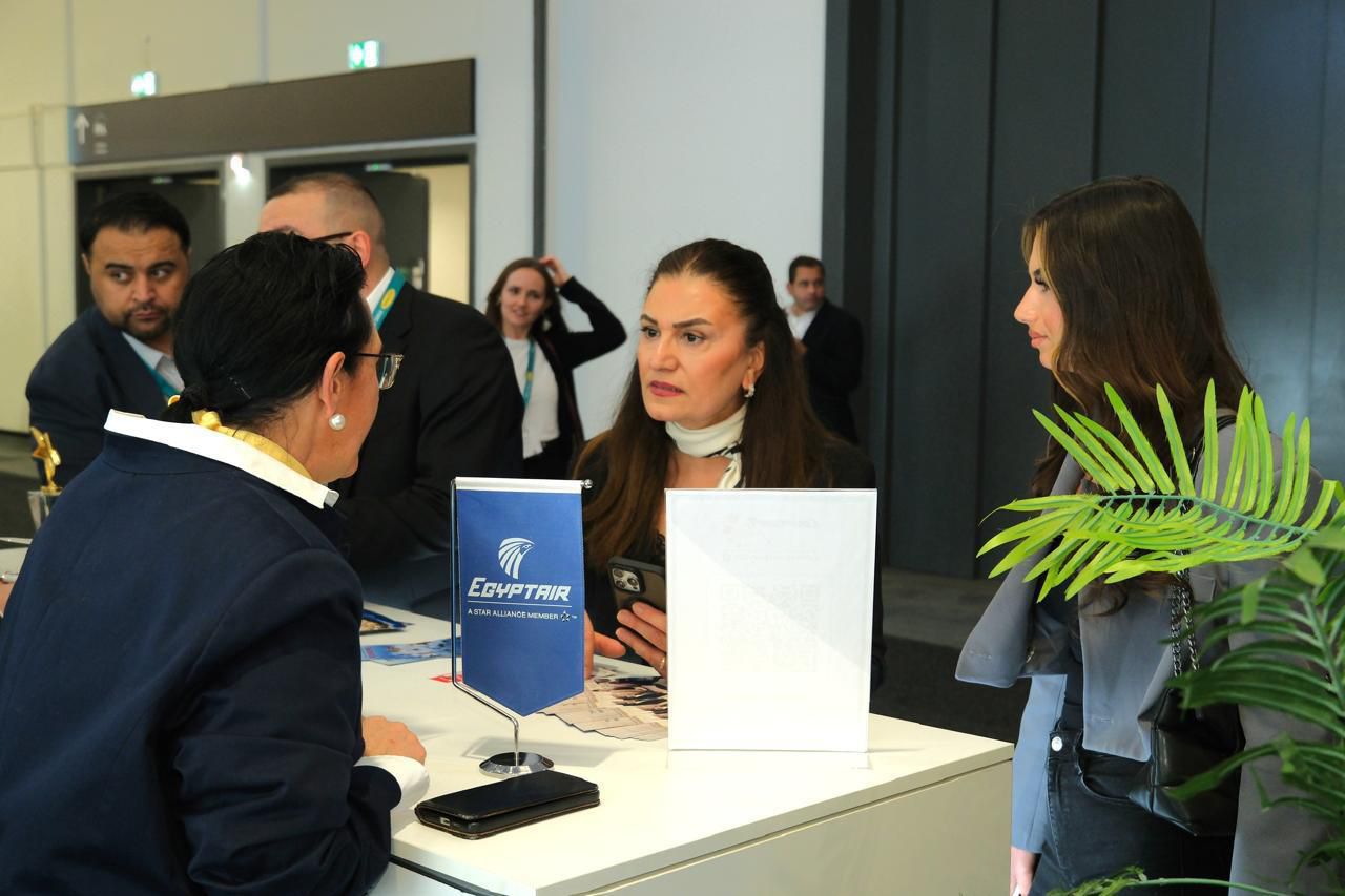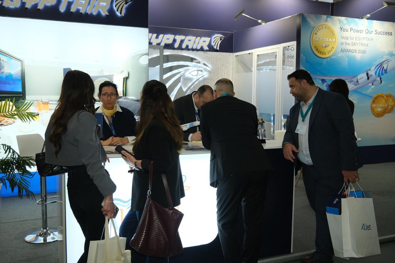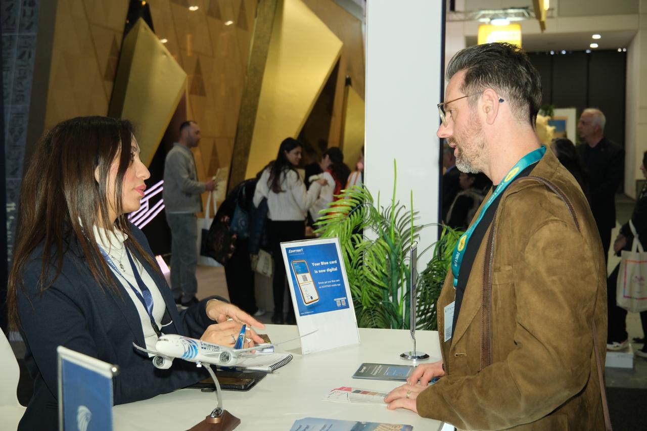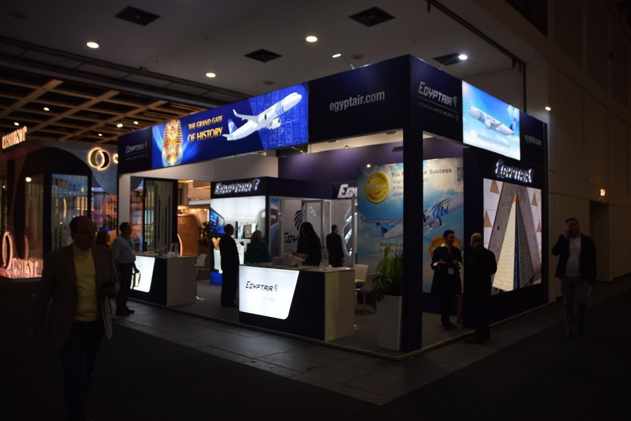 ومن خلال جناحها المشارك بالمعرض، حرصت مصر للطيران على استعراض أحدث خدماتها وعروضها الترويجية.