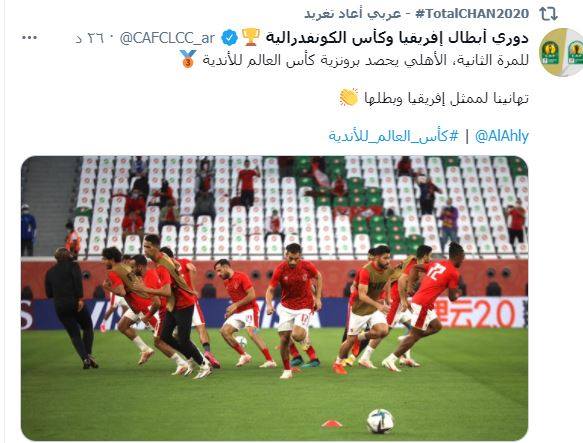 وغرد «كاف» عبر حسابه قائلًا: «للمرة الثانية الأهلي يحصد برونزية كأس العالم للأندية.. تهانينا لممثل إفريقيا وبطلها».