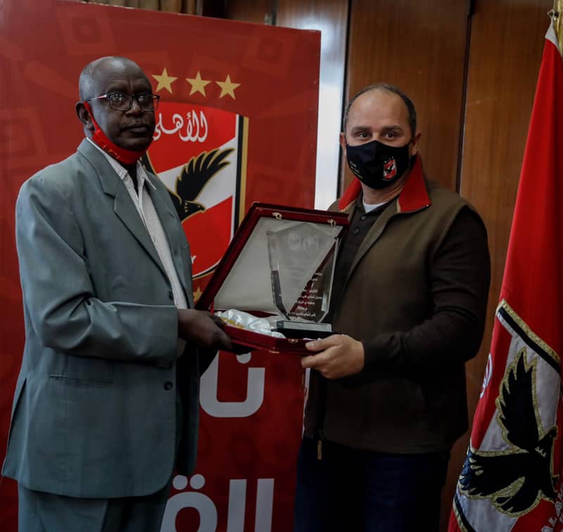 ومن جانبه رحب العميد محمد مرجان المدير التنفيذي للنادي بالوفد السوداني في مقر الأهلي بالجزيرة، مؤكدا أنهم في بلدهم الثاني مصر، وقام بإهداء رئيس بعثة المريخ درع وعلم الأهلي تقديرا وتكريما لهم، متمنيا لهم التوفيق.