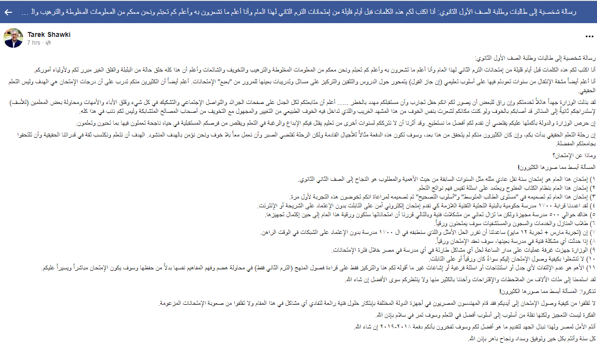 رسالة وزير التعليم الي طلاب الصف الاول الثانوي